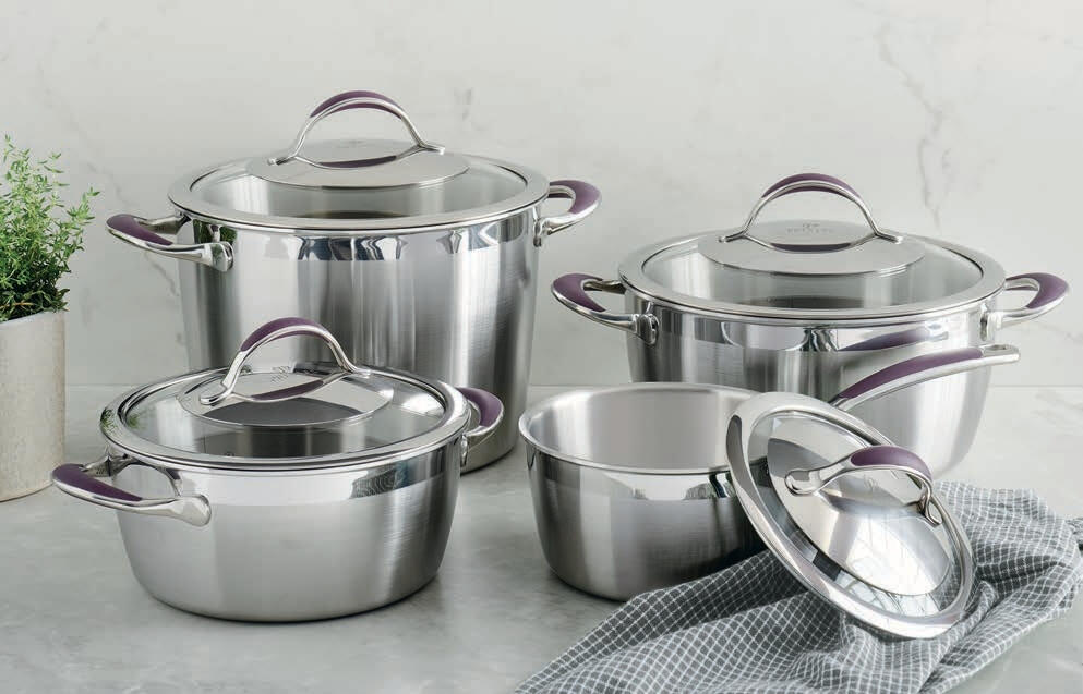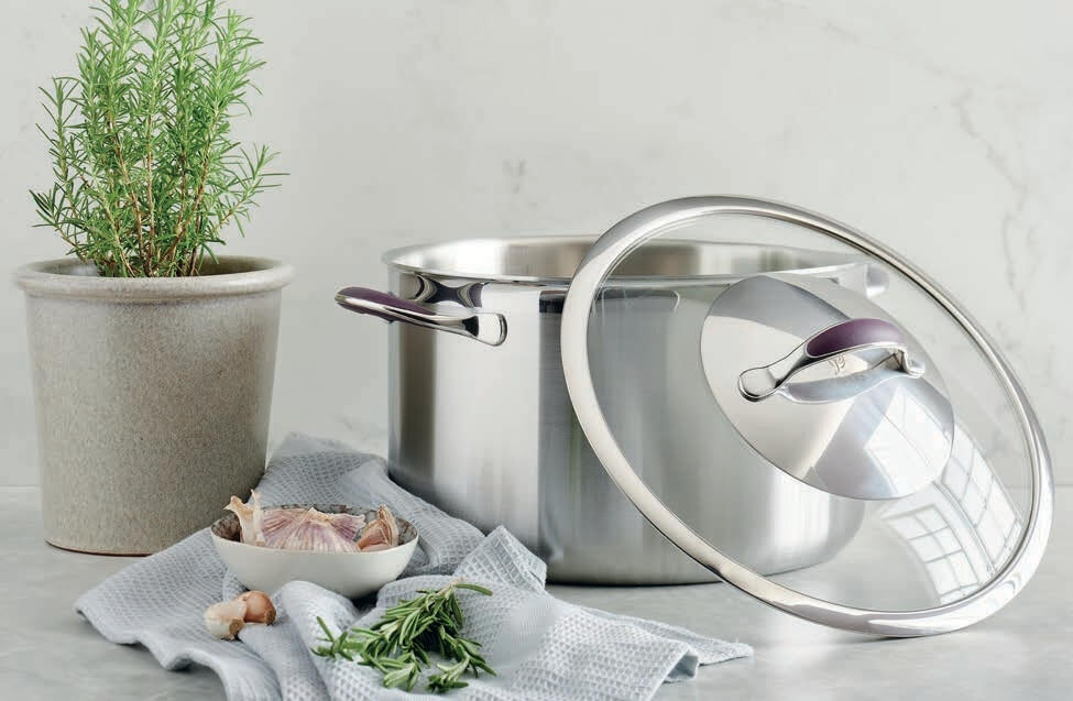 Pres Les Premium Cookware is elegantly crafted with brushed stainless steel finishes, flared rims for easy pouring, tempered glass see-through lids and cool-touch silicone handles.